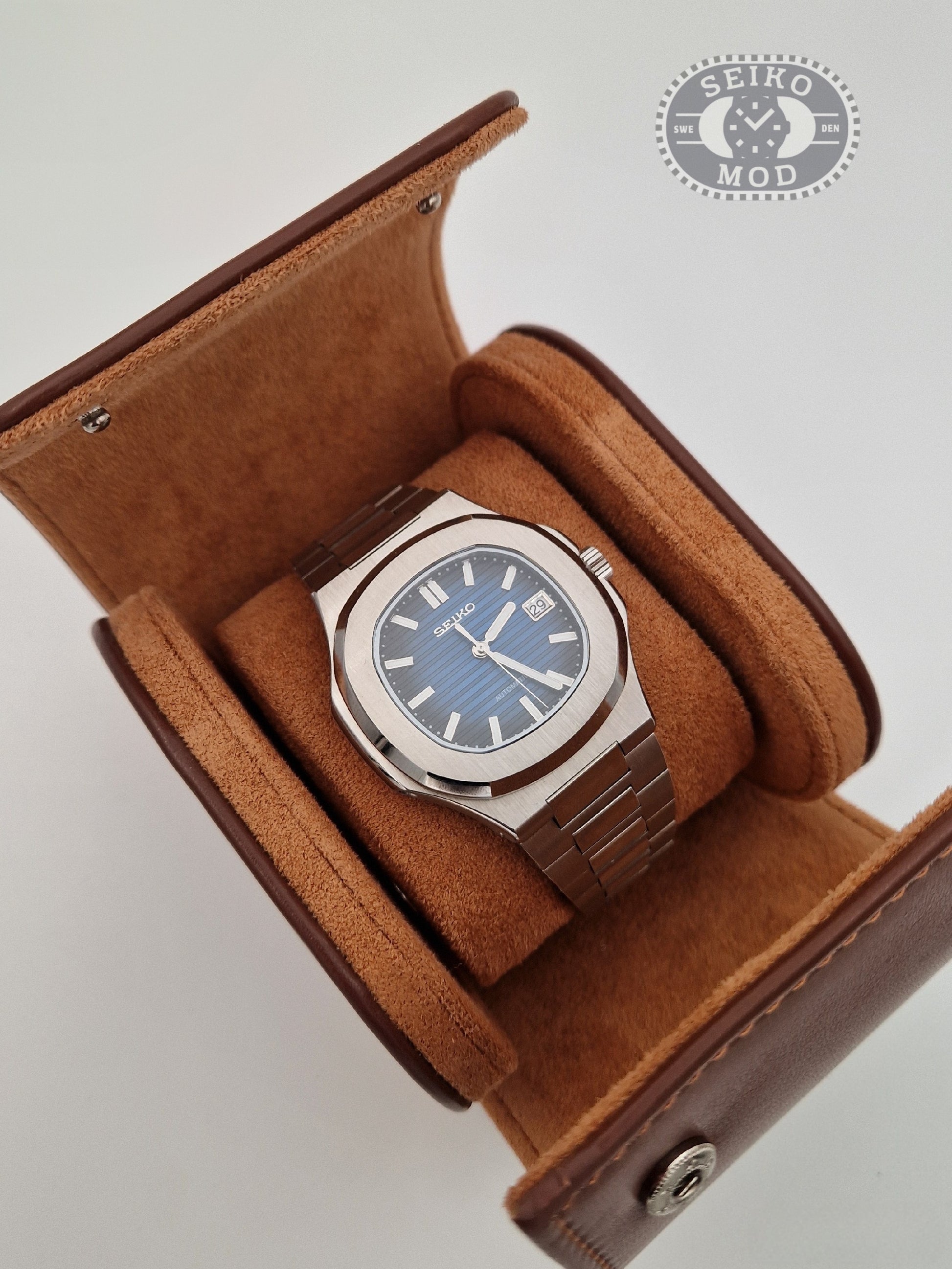 Skydda dina värdefulla klockor med stil under resan med vårt eleganta resefodral i konstgjort läder. Handgjort med noggrant utvalt material för en lyxig känsla och varaktig hållbarhet. Detta resefodral är designat för att säkert hålla dina klockor på plats, med en mjuk inredning som förhindrar repor och skador. Det kompakta formatet gör det enkelt att packa, medan den robusta konstruktionen säkerställer att dina klockor är skyddade under alla dina äventyr. Perfekt för klockälskaren på språng.